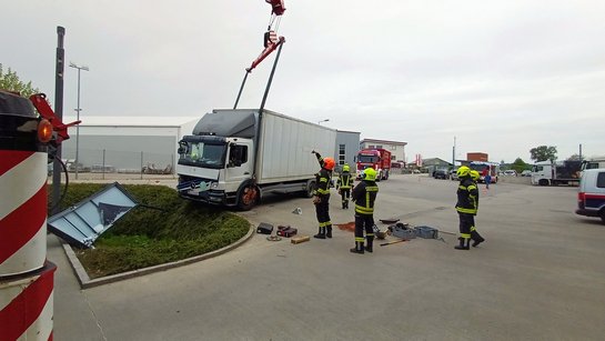 Am Freitag den 9.Mai 2025 alarmierte uns die LWZ um 08:50 Uhr zu einem nicht alltäglichen Einsatz. Ein abgestellter LKW mit Anhänger war aus bislang unbekannter Ursache ins Rollen geraten, überquerte die abschüssige Einfahrt des Kundenparkplatzes der Firma Hütthaler und kam in einer Versickerungsmulde für Regenwasser zum Stillstand. Zum Zeitpunkt des Vorfalls befand sich der Fahrer nicht im Fahrzeug.